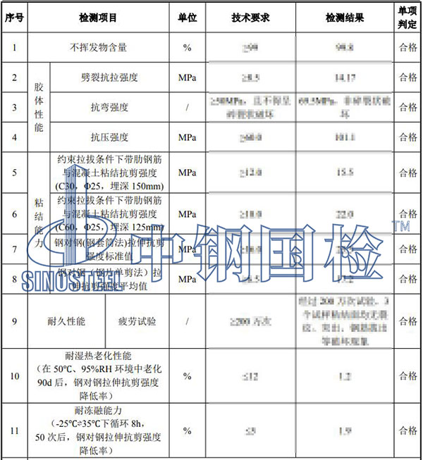 檢測(cè)結(jié)論:送檢樣品所檢項(xiàng)目符合 GB 50367-2013、GB 50728-2011、JG/T 340-2011 標(biāo)準(zhǔn)要求。